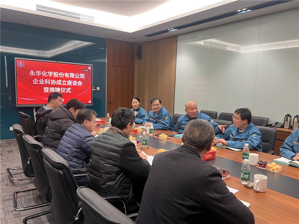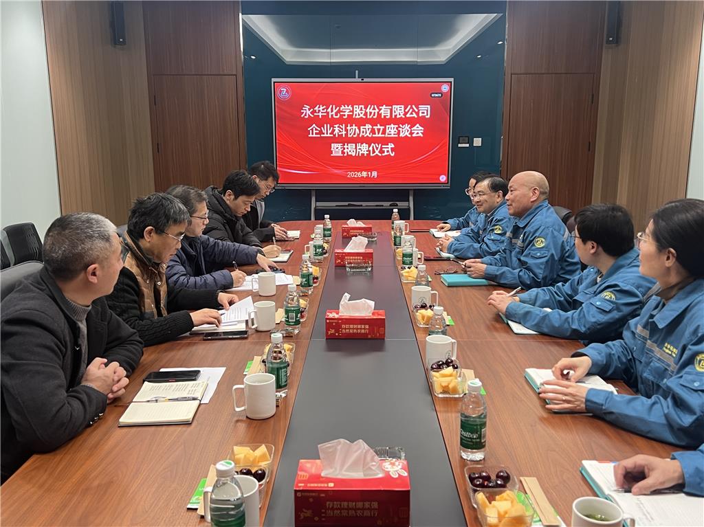 1月14日,永華化學(xué)股份有限公司企業(yè)科學(xué)技術(shù)協(xié)會成立座談會暨揭牌儀式在福山工廠順利舉行,標(biāo)志著公司在科技創(chuàng)新與人才培養(yǎng)方面邁出堅(jiān)實(shí)一步。常熟市科學(xué)技術(shù)協(xié)會副主席呂廷鈞、科創(chuàng)部部長余正茂、副部長吳圣華、海虞鎮(zhèn)科技人才辦主任陶智明、永華化學(xué)科協(xié)副主席戴惠明等出席儀式并為永華化學(xué)企業(yè)科協(xié)揭牌。