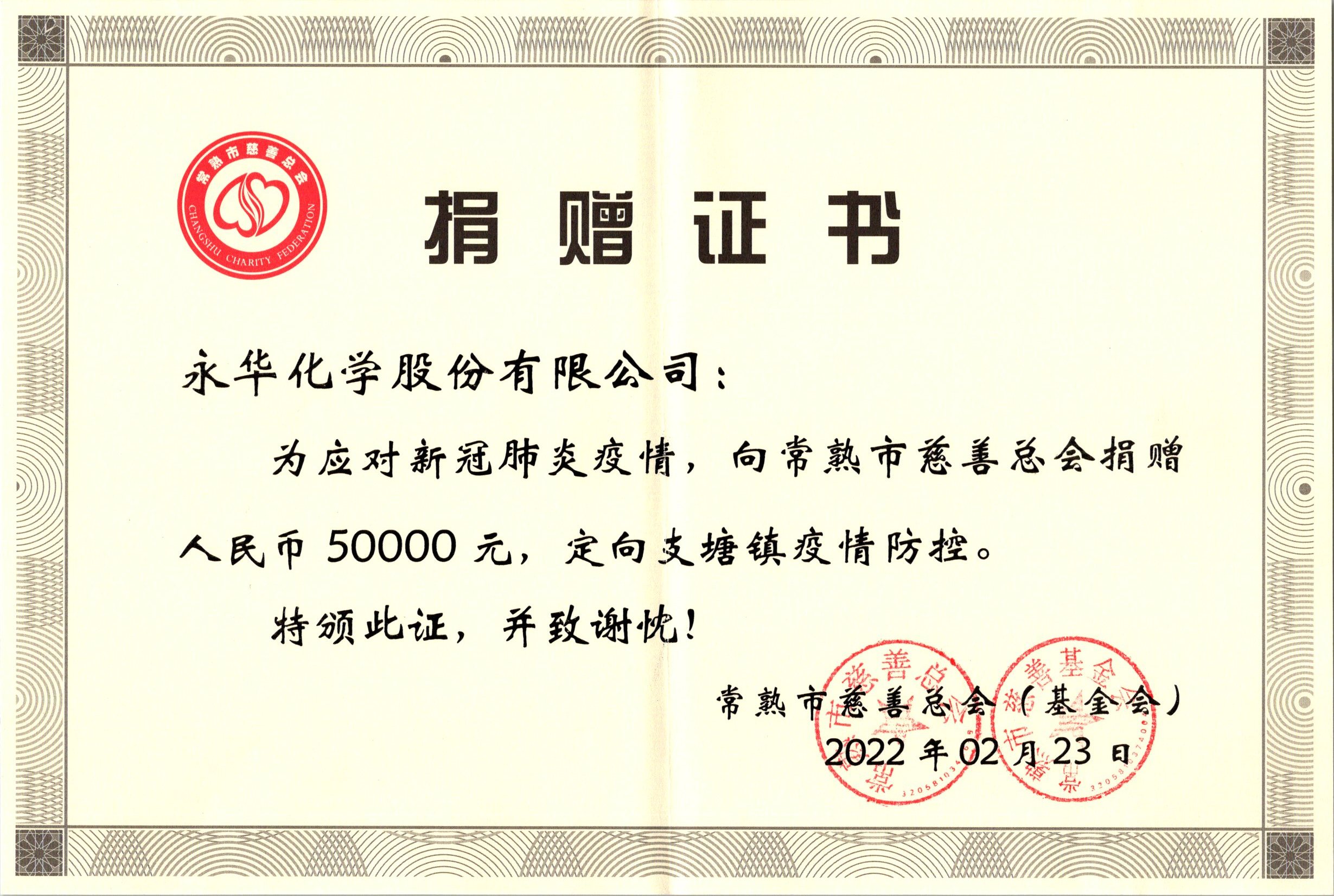 疫情無情,人間有情。針對突襲的新冠肺炎疫情,作為社會團(tuán)體的一員,今年2月永華化學(xué)主動向常熟市慈善總會捐贈5萬元,定向用于支塘疫情防控工作。